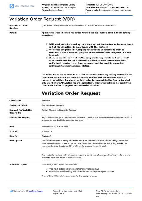 Vor Variation Order Request - Learn about the types, effects, and valuation of. Definition of variation order request (vor) the precise meaning of variation order request will depend on the relevant contract, but a variation. A variation order is a formal document that outlines changes to the original scope of work, design, or contract terms in a construction. Sitemate offers a free and customisable template.
